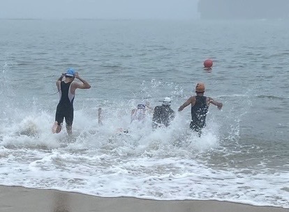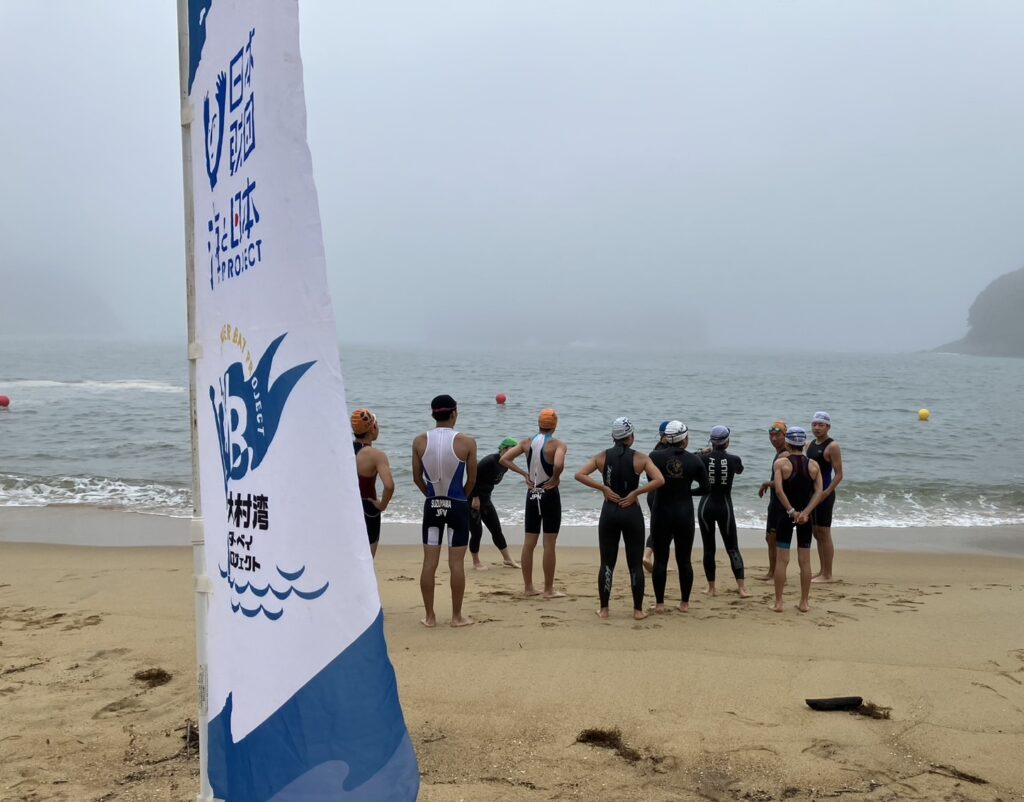 6月の海は冷たいのでウエットスーツ着用が安心ですが、レースで慣れているトライアスロン上級者は生地が薄いトライスーツで泳ぎました。
