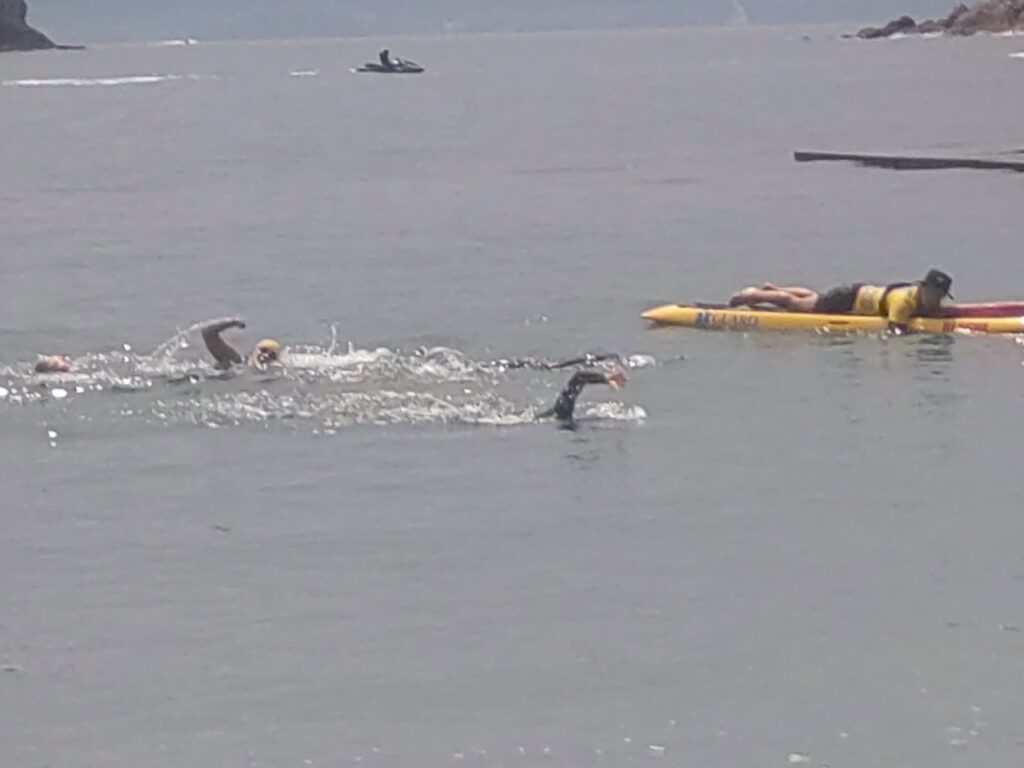 練習の前半はプールと違って「コースロープがない、足がつかない、塩辛い」海に慣れるための練習です。